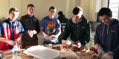 Volunteers gather in our kitchen to prepare brown bag meals for those served by The Night Ministry of Chicago. Donations of bread, cookies and cash for sandwich meat and cheese are welcome.